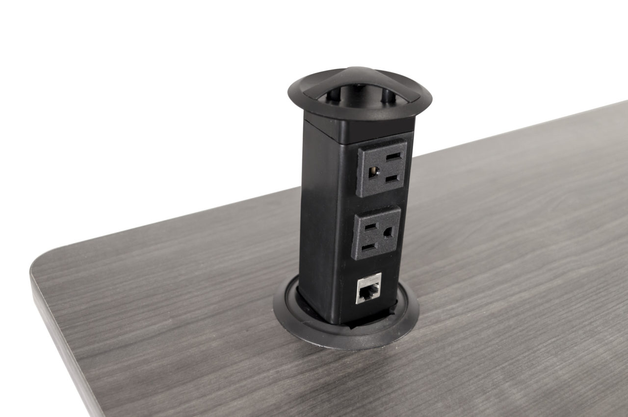 Le boitier d’alimentation est encastré et enrichit le flux de travail quotidien en cours d’utilisation et peut être caché lorsqu’il n’est pas utilisé. Les prises à courant alternatif sont positionnées dynamiquement pour une gestion plus simple de l’accès à l’alimentation électrique. Remarque: nécessite un alésage de 3 po pour l’installation et un minimum de 12 po de dégagement sous la surface de montage pour fonctionner correctement.