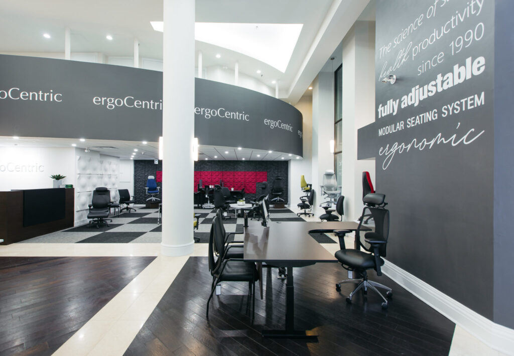 Inside the historic King Edward hotel, located in the heart of downtown Toronto at 37 King Street East, the new 4,000 square foot ergoCentric showroom&store is staffed with ergoCentric sales experts. Every item on display can be purchased and taken away immediately, or can be ordered to suit any number of body types, tasks, or environments. With a modular approach to manufacturing, ergoCentric configures thousands of different ergonomic chairs for its customers, ensuring a perfect fit for virtually 100% of the population. ergoCentric seating is used by Apple, Nasa, Nike and thousands of other organizations.